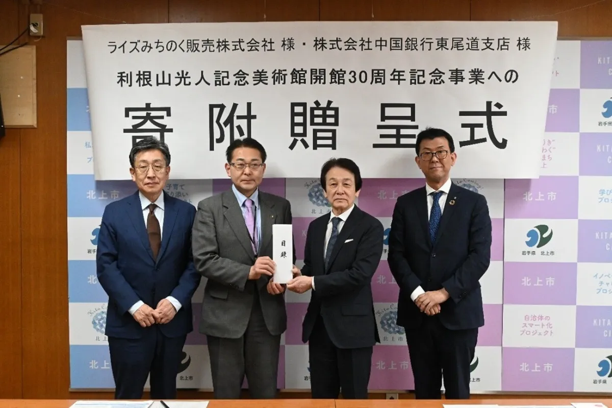 寄贈式には、北上市教育委員会の船田教育長、市長の八重樫氏、ライズみちのく販売の奥本代表取締役、中国銀行東尾道支店の原野支店長らが参加しました。地域の教育や文化事業に対する支援として非常に意義深い場となりました。これにより、地域の交流と共助を促進することが期待されています。
