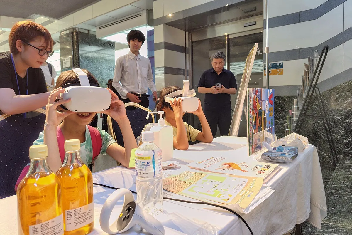 来場者は子供から大人まで楽しめる体験プログラムに参加できます。視覚障害体験や、天然染料を使った染色に加えて、使用済み食用油から作る航空燃料SAFの製造過程をVRで体験できます。どれも環境を意識した新たな発見につながる内容です。