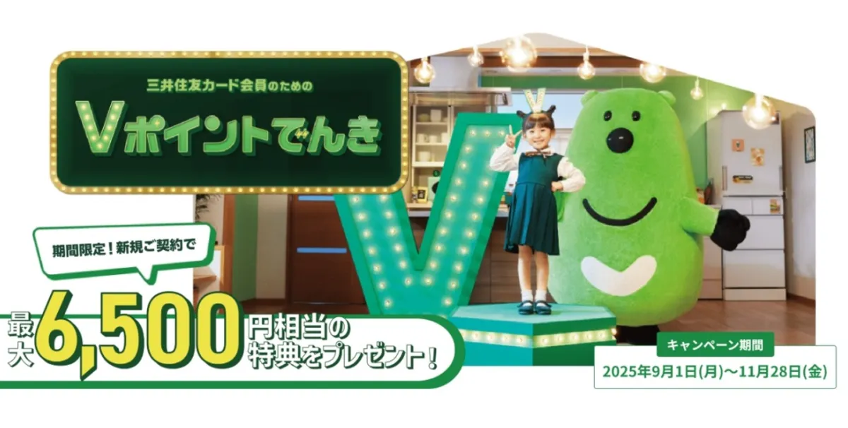 三井住友カード株式会社とauエネルギー&ライフ株式会社が共同で提供している「Vポイントでんき」では、2025年9月1日から新たに契約を行った方を対象に、最大6,500円相当の特典が用意されています。この機会にぜひお得な特典を活用してみてはいかがでしょうか。