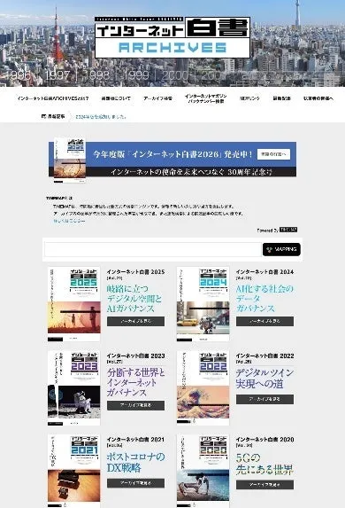 「インターネット白書ARCHIVES」は、1996年以降のインターネットの発展を記録した年鑑であり、2026年版の発行をもって30年目を迎えるのです。このアーカイブでは、歴代の白書だけでなく、1994年から2006年まで発行されていた「インターネットマガジン」のバックナンバーも閲覧可能です。検索機能には「TIMEMAP」を採用しており、直感的な使いやすさが魅力です。ユーザーはキーワードを入力することで、インターネットに関する様々な情報を時系列で探し出せます。