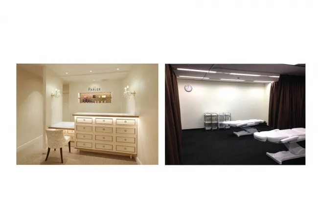 東京・銀座と大阪・梅田に開設されたトレーニングセンターは、新入社員研修やスキルアップ研修などに利用されます。受付スペース、カウンセリングルームに加え、可動式ルームを完備。最大40名規模の講義や、10台以上の施術ベッドを設置できるなど、充実した設備が整えられています。