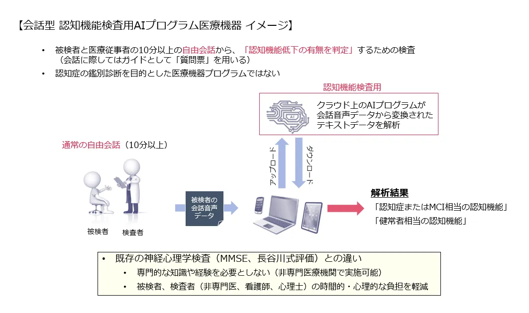 本機器は、高度なAI技術「KIBIT」を採用し、患者と医療従事者の間で10分以上の自由な会話を通じて認知機能の低下を判定します。このアプローチは、短時間で高精度な結果を提供することを目的としています。従来の認知機能検査における煩雑さを解消し、医師が迅速かつ適切に判断を下すための支援を行います。
