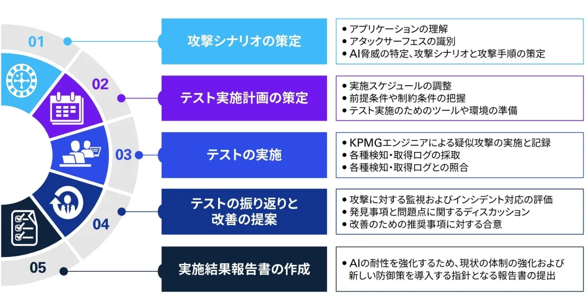 KPMGのAIレッドチームサービスでは、サイバーセキュリティ専門のプロフェッショナルがチームを組成し、包括的なサポートを提供します。具体的には、以下の活動が含まれます: