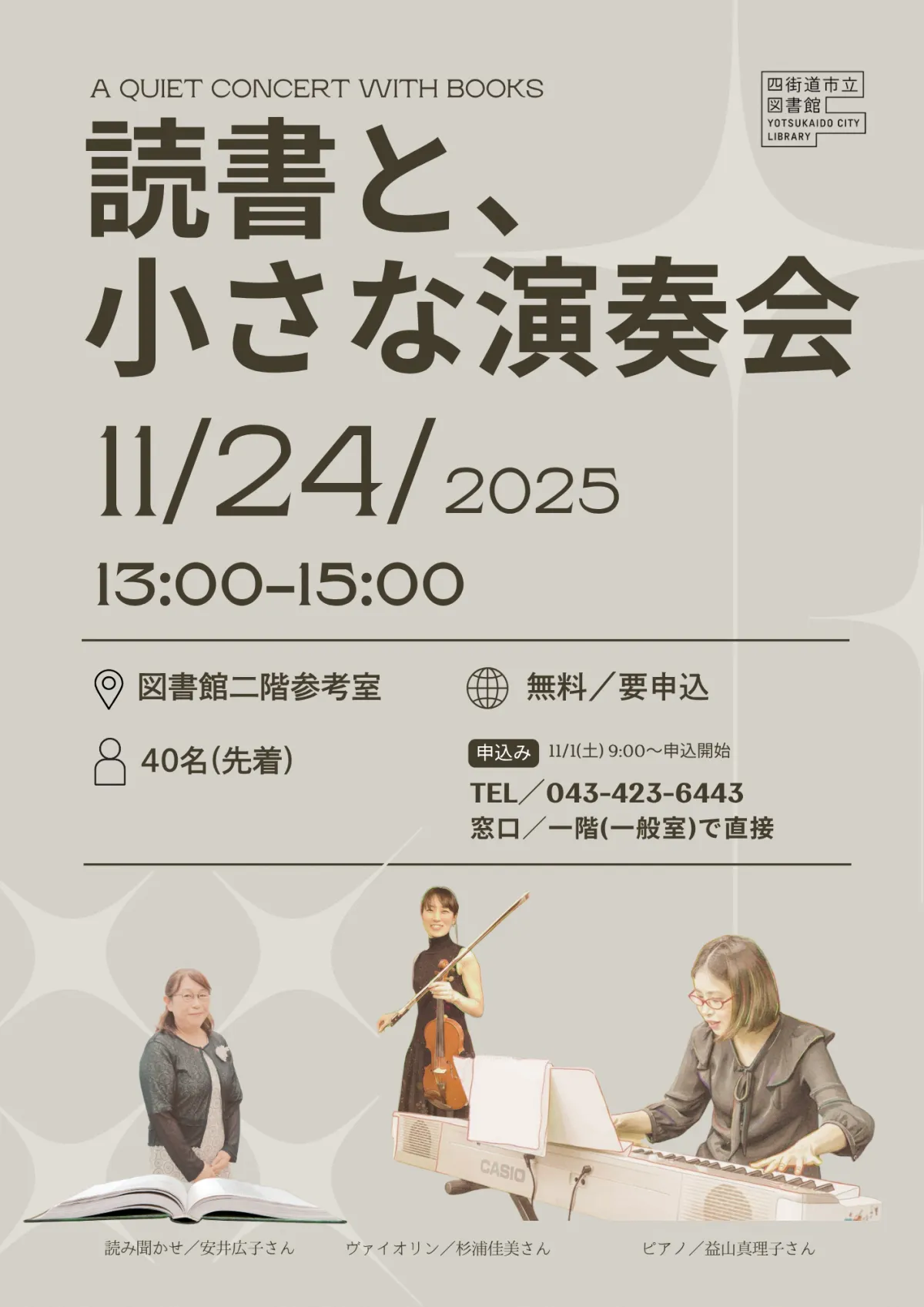 11月24日、四街道市立図書館で「読書と小さな演奏会」が開催されます。このイベントは、心地よい音楽と共に読書を楽しむことができる特別な機会です。音楽が、読む人の時間に寄り添い、一つの空間で生まれる特別なひとときを堪能しましょう。