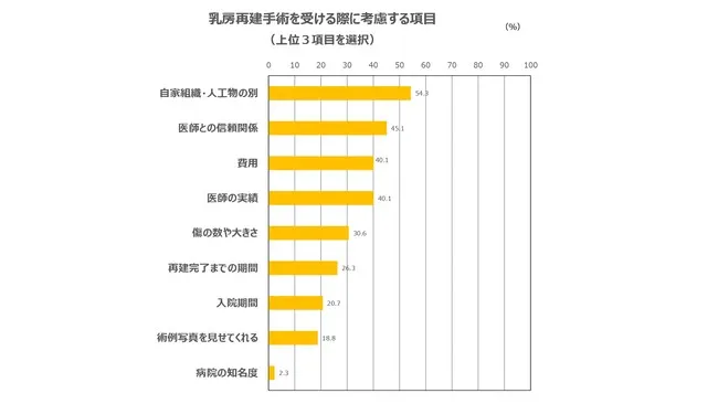 調査によると、再建手術を受ける際に最も重要視される要素は、例年と同様に「自家組織・人工物の別」、「医師との信頼関係」、「医師の実績」が上位を占めていました。