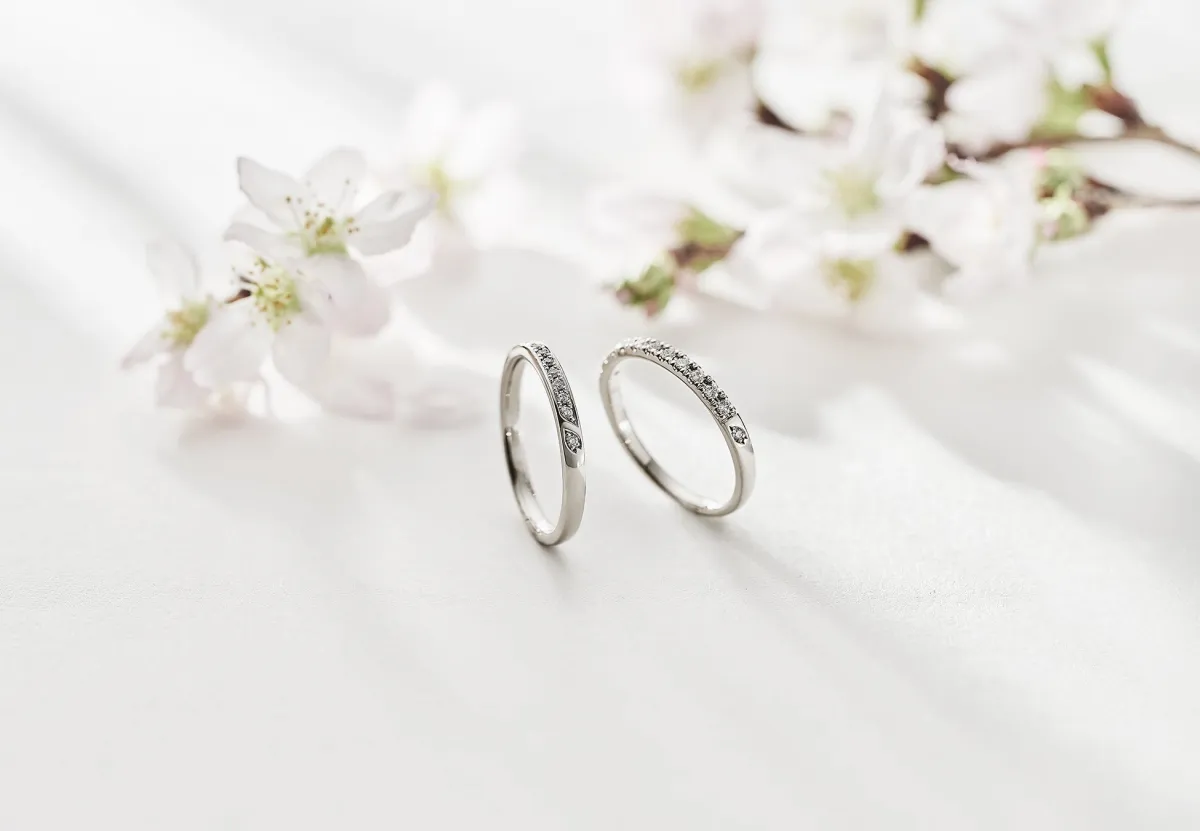 このリングのデザインは、静かに連なる光をモチーフにしており、優しい春の陽射しに照らされる桜を表現しています。ダイヤモンドを地金に埋め込むことで、光を受けた時の輝きが引き立ち、まるで桜が舞うようです。