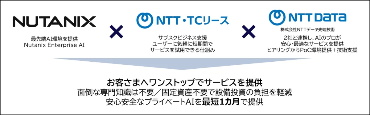 このプロジェクトでは、Nutanixはプラットフォームを提供し、Private環境での生成AIの統合管理を可能にする「Nutanix Enterprise AI」を採用しています。そして、ファイナンスのノウハウに精通したNTT・TCリースが、サブスクリプションモデルを担い、NTTデータ先端技術が安心・安全なPrivate AIシステムの構築を担当しています。