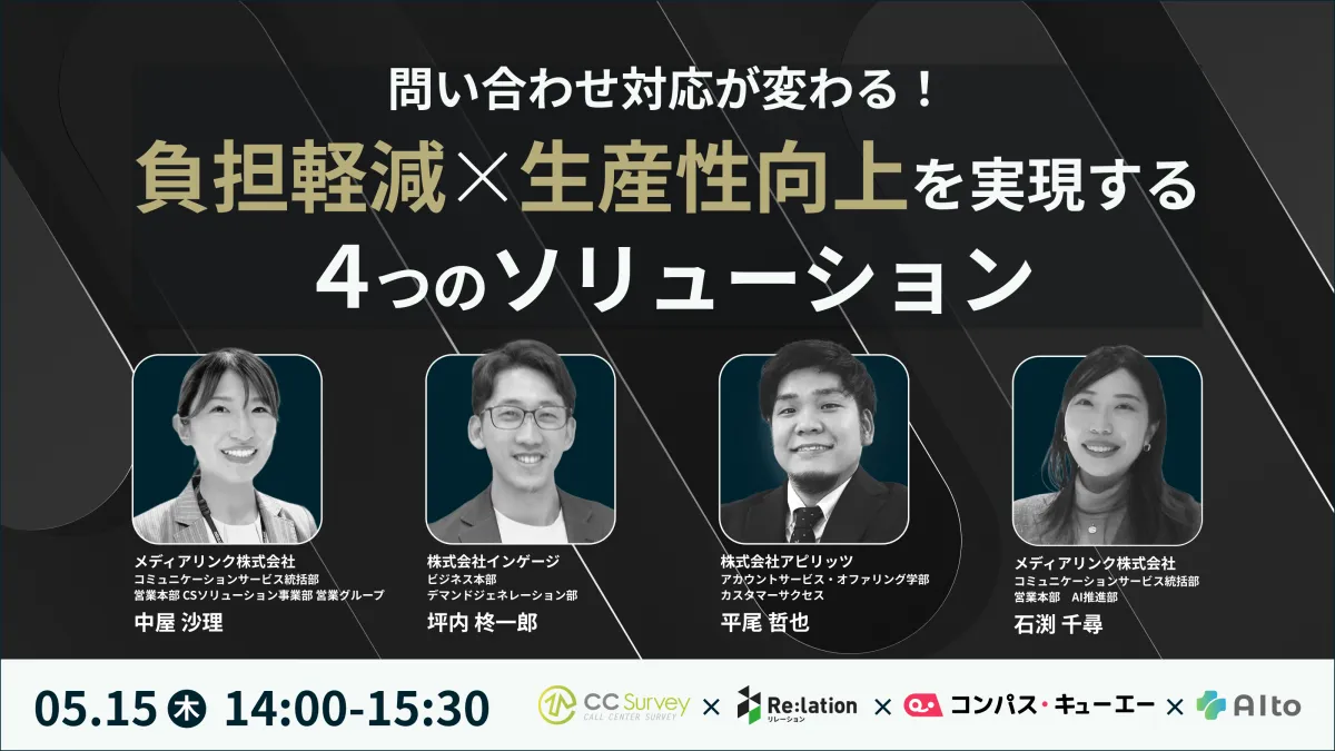 メディアリンク株式会社は、株式会社インゲージ主催のオンラインセミナーに参加します。「負担軽減×生産性向上」をテーマに、顧客サポートを強化するための4つのソリューションを紹介します。このセミナーは2025年5月15日(木)14:00から15:30に開催され、参加は無料です。事前の登録が必要で、申し込まれた方には視聴用のURLがメールで送られます。