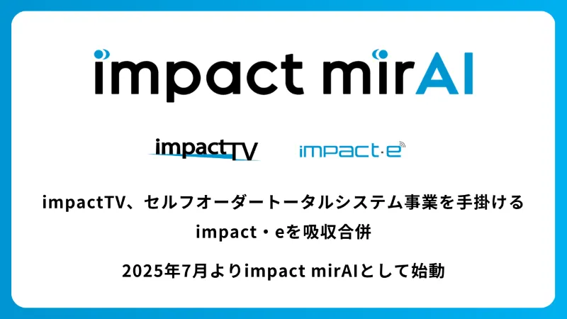 2025年7月1日、インパクトホールディングス株式会社は、連結子会社のimpactTVとimpact・eを吸収合併し、新たに株式会社impact mirAIを設立しました。この決定は、デジタルサイネージやICT及びIoT事業を推進しているimpactTVが、外食企業向けのセルフオーダートータルシステム事業を展開するimpact・eと連携し、競争力を強化することを目的としています。