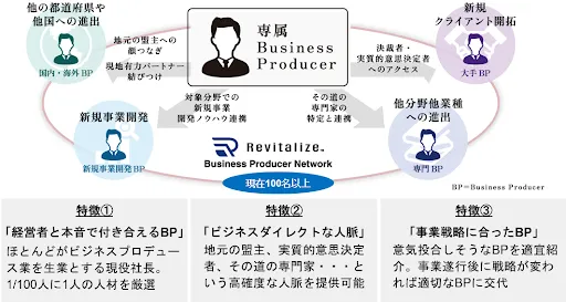 Revitalizeは、企業向けのパートナーシップを築くためのプラットフォームとしても機能しています。地方創生や地域経済に対する取り組みが重要視される中、ビジネスプロデューサーたちは、企業の成長や革新に貢献するための鍵となる存在です。彼らは企業の戦略的な支援を行い、将来的な成長を見据えたプロジェクトに参加します。