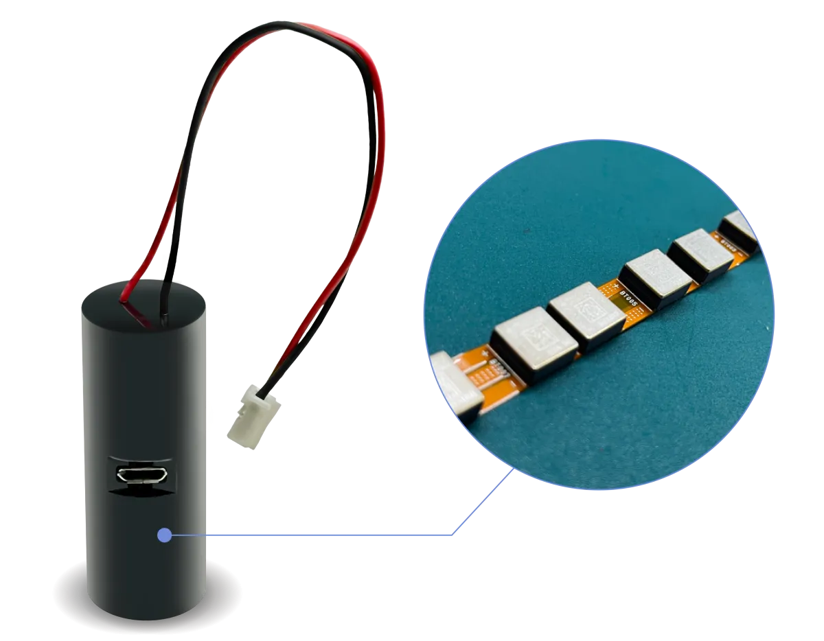 新たに開発された全固体電池モジュールは、直径17.9mm、高さ50mmという汎用的なER電池サイズに対応しており、量産品の全固体電池「PSB401010H」を8個搭載することで、合計35mAhの容量を実現しました。さらに電圧を3.6Vに変換し、内部に充電回路を備えているため、5Vの充電に対応することができます。