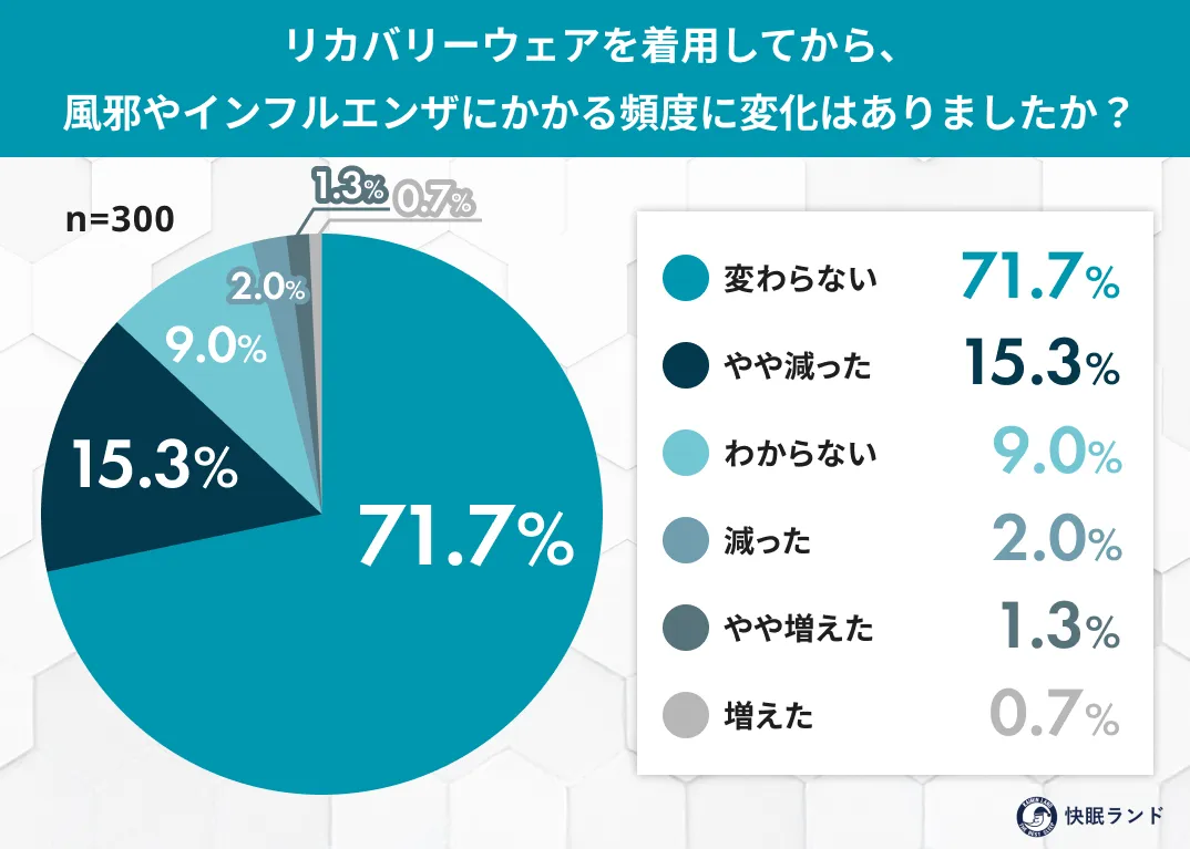 調査結果によれば、リカバリーウェア着用者の17.3%が「風邪やインフルエンザにかかる頻度が減った」と感じています。また、25.2%の人々が「疲労感が軽減した」と答え、18.0%が「冷えが改善した」と回答しました。これらの回答から、リカバリーウェアが日常的な体調管理において役立っていることがうかがえます。