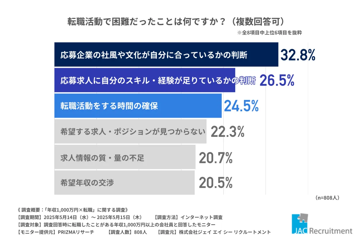 転職活動で直面する課題として、求職者はいくつかの要因を挙げています。企業文化が自分に合うかの判断や、自分のスキルが十分かどうかの見極めが、特に難しいと感じているようです。このことからも、転職希望者は自分の適性と希望条件が合致する職場を求めていると考えられます。