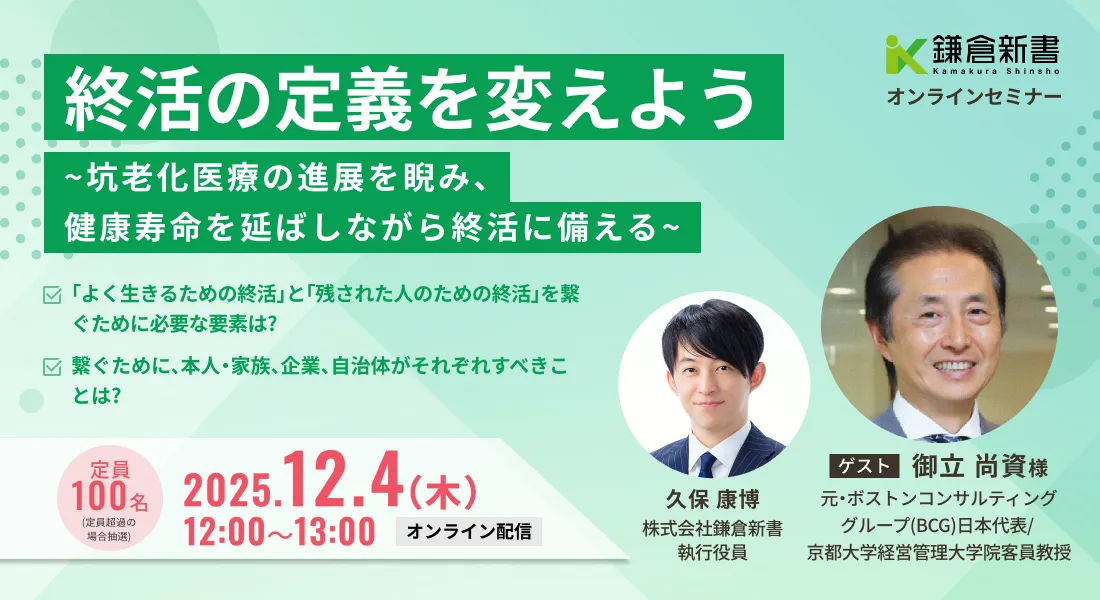 超高齢社会が進行する中で、日本では「終活」という言葉が注目を浴びています。終活は、人生の終焉を迎える準備をすることを意味し、最近ではその重要性が一層増してきています。特に平均寿命が延びる現代においては、単に終わりを考えるだけでなく、健康な生活を長く維持することが求められています。そんな中、株式会社鎌倉新書が主催するオンラインセミナーが2025年12月4日に開催されます。このセミナーでは、抗老化医療に焦点を当て、健康寿命を延ばしながらの終活のあり方を探る機会が提供されます。