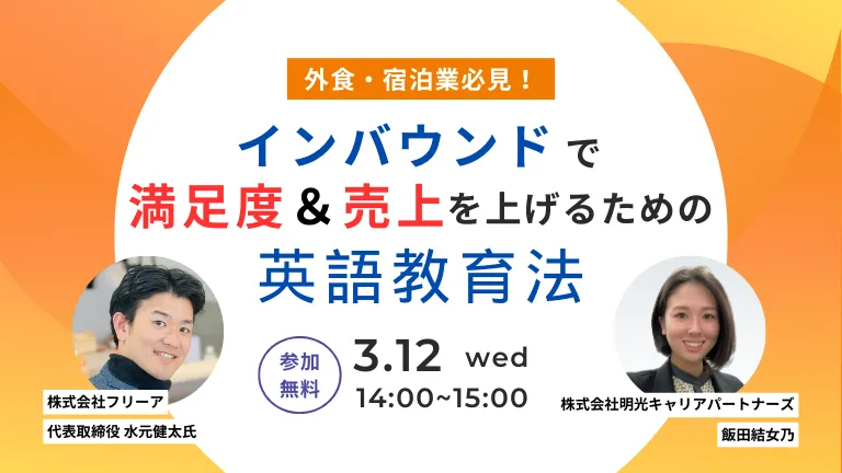 次に、フリーアの代表取締役、水元健太氏が登場し、外食・宿泊業向けの具体的な英語教育プログラムを紹介します。プログラムの流れや内容を詳しく解説し、参加者が英語教育を受けることでどのような成果が期待できるのかを示します。最後に質疑応答の時間を設け、受講者の疑問に対して丁寧にお答えする予定です。