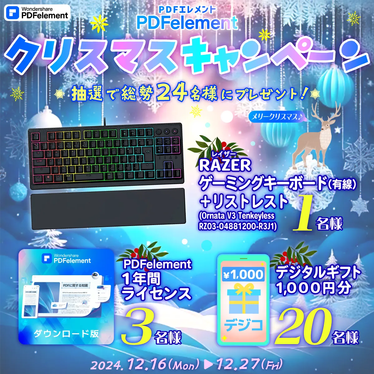 株式会社ワンダーシェアーソフトウェアが提供しているPDFエレメントが、今年のクリスマスに向けて特別なキャンペーンを実施しています。このキャンペーンでは、豪華な賞品が抽選で当たるチャンスがあり、多くのユーザーに喜ばれている注目のイベントです。