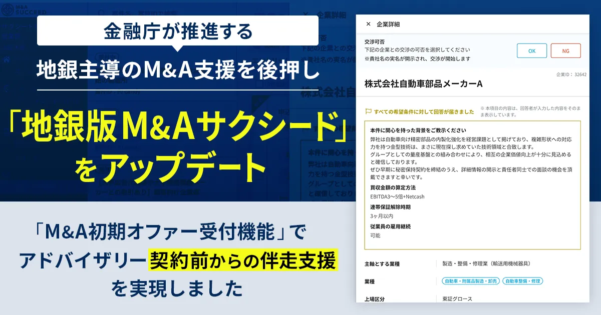 株式会社M&Aサクシードは、地域金融機関向けの法人限定M&Aプラットフォーム「地銀版M&Aサクシード」をアップデートし、新機能「M&A初期オファー受付機能」を2026年4月7日より提供開始します。この新機能は、地域金融機関の担当者がアドバイザリー契約を結ぶ前から、顧客であるオーナー経営者に対して、譲受候補企業からの具体的な条件や金額を提示できる仕組みを提供します。