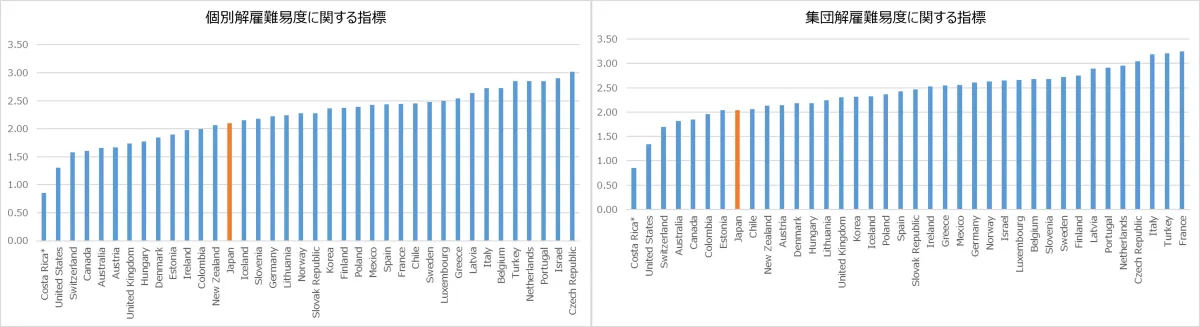 同社の調査によると、2020年度におけるOECD諸国42カ国における個別解雇難易度において、日本は26位、集団解雇難易度では33位に位置しています。これらの数値から、日本の解雇規制は意外にも緩やかであると言えます。