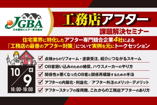 2023年10月9日、一般社団法人日本優良ビルダー普及協会(JGBA)は「工務店アフター課題解決セミナー」をリアルとオンラインで開催し、63名の参加者が集まりました。このイベントは、工務店同士が学び合い、業界の課題を解決するための重要な機会として注目されています。