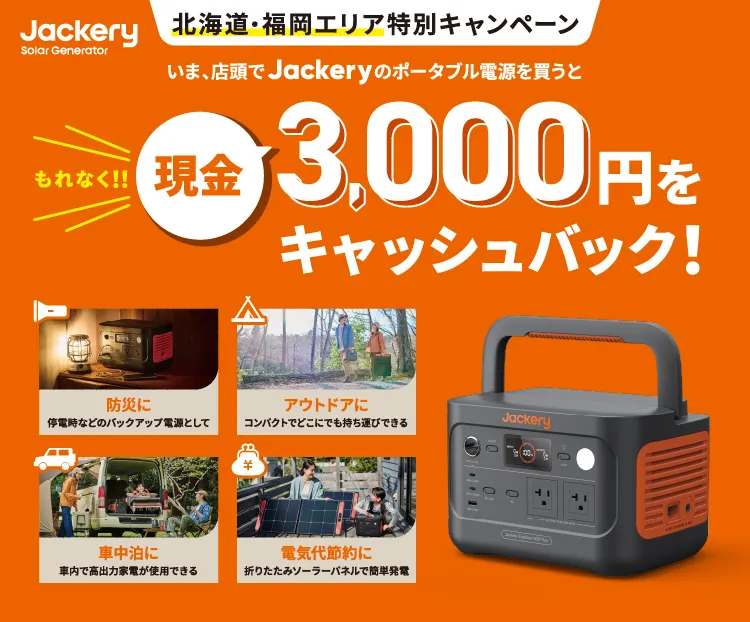 Jackery(ジャクリ)は、2024年8月1日から9月6日までの期間、北海道と福岡県内の正規取扱店にて、ポータブル電源の購入者に対して現金3,000円のキャッシュバックキャンペーンを実施します。このキャンペーンは、Jackery製品を購入した方なら誰でも参加できるお得な機会です。