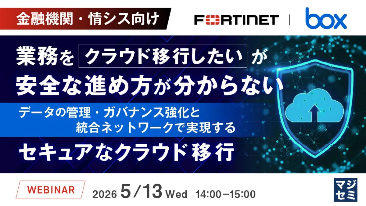 本ウェビナーは、フォーティネットジャパン合同会社と株式会社Box Japanの主催で、協力には株式会社オープンソース活用研究所およびマジセミ株式会社が名を連ねています。金融機関における影響力のある第一線の情報をお届けします。