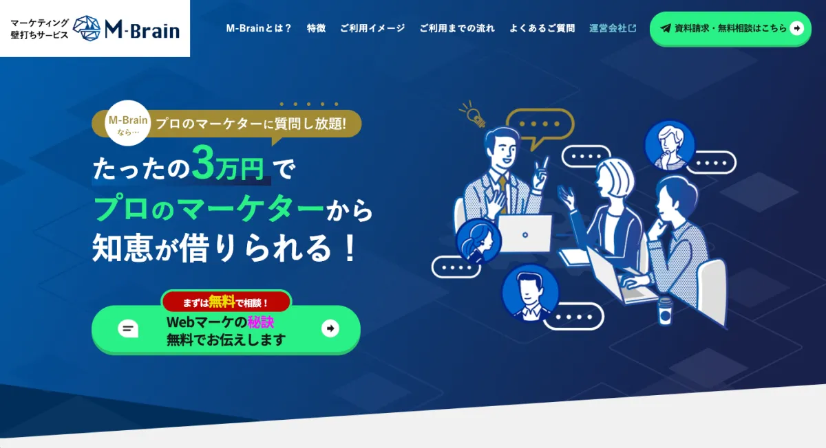 M-Brainは、マーケティング戦略の全般にわたる相談が可能であり、Web広告やSEO対策、Web制作、さらにはインハウス化についてもアドバイスを受けられるデジタルマーケティングを中心としたサービスです。企業が抱える多様な課題に対し、実際に現場で活動しているプロのマーケターが直接相談に乗ることができるため、非常に実践的かつ即効性のある支援が特徴です。
