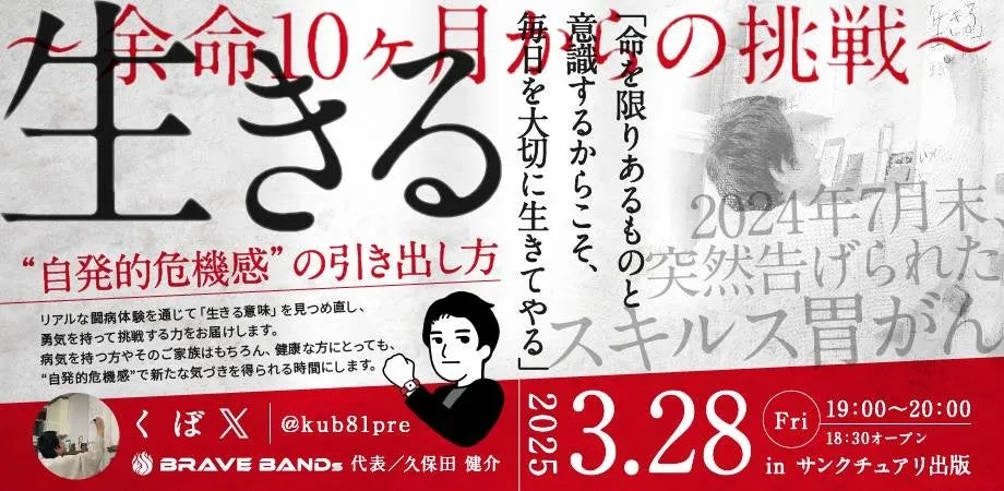 2025年3月28日(金)、スキルス胃がんと闘病するインフルエンサー、くぼ氏が人生初の講演会「生きる〜余命10ヶ月からの挑戦」を開催し、564枚のチケットを販売しました。この数字は、その道のりで最も成功した記録となりました。この講演会は、サンクチュアリ出版が提供するイベントの中でも特に注目を集めています。