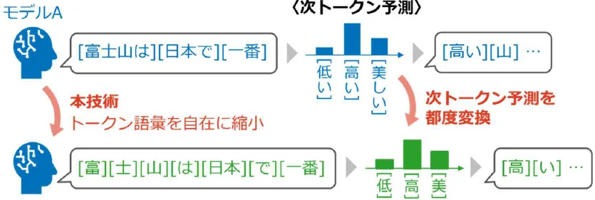 NTTが開発した技術は、推論におけるトークンの語彙集合を精度を損なうことなく、自在に縮小することができる理論とアルゴリズムに基づいています。従来、異なるLLM間ではトークン語彙が一致しないため、互いに情報を参照することが難しかったのですが、この新技術を用いることで、任意の異種LLM間で共通のトークンを通じて推論が可能となります。これにより、アンサンブルやポータブルチューニングなど様々な連携が実現し、量的な知識の統合と質的な精度向上が期待されています。