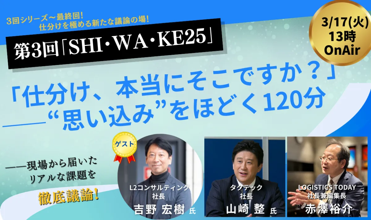 株式会社タクテックが主催するオンラインイベント、第3回「SHI・WA・KE25」が2026年3月17日に開催されることが決定しました。このイベントは、物流業界の現状に特化した内容で、仕分け工程をテーマに取り上げます。特に、仕分け工程は現場で見える詰まりとしてしばしば指摘されますが、本当にその視点で問題を俯瞰できるのか、そんな疑問を持っています。