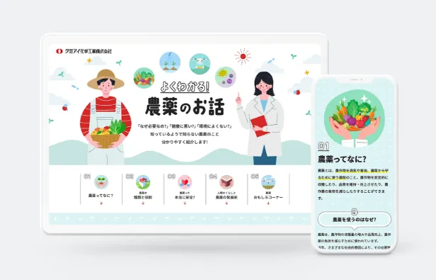 株式会社マイクロウェーブクリエイティブは、クミアイ化学工業株式会社の依頼により、農薬に関する学習コンテンツを盛り込んだLP(ランディングページ)を制作しました。このプロジェクトは、農薬に関する正確な知識を消費者、特にお子様を含む幅広い世代に提供することを目的として始まりました。