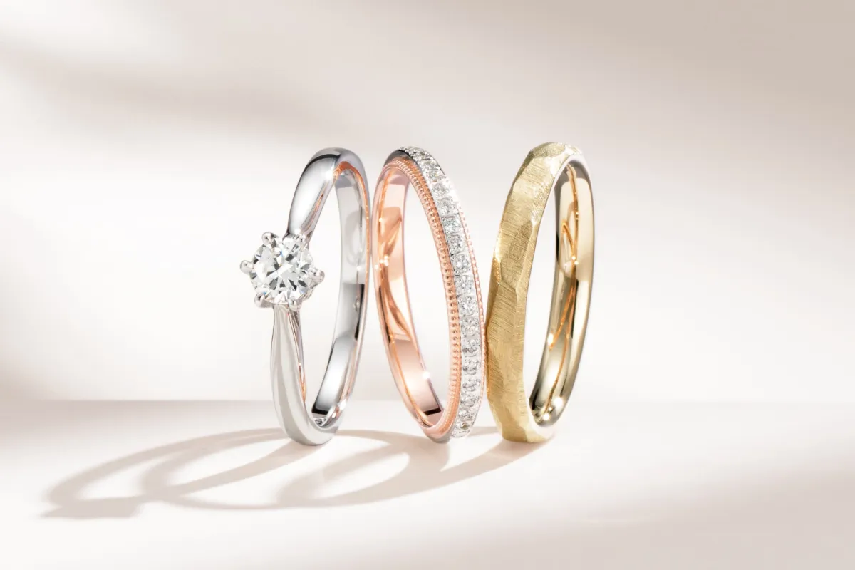 お好みのリング幅や素材を選び、各種デザインと組み合わせることができるカスタマイズ機能が特徴です。お二人の個性を表現し、唯一無二の存在感を持つジュエリーを楽しめます。デザインの多様性も豊かで、90種類以上の選択肢があなたを待っています。