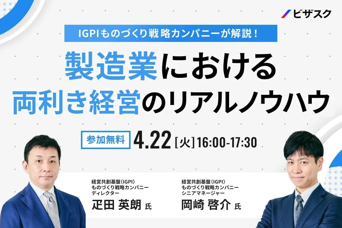 企業の経営者や戦略担当者にとって、新しいアイデアや実践的な知識を得ることは差別化の重要な要素です。この4月22日(火)16:00、株式会社ビザスクが主催する無料オンラインセミナー『製造業における両利き経営のリアルノウハウ』が開催されます。このセミナーでは経営共創基盤(IGPI)の実力派スピーカー、ディレクターの疋田英朗氏とシニアマネージャーの岡崎啓介氏が登壇し、製造業における新しい戦略や手法について詳しく語ります。