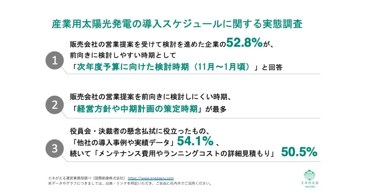 企業の産業用太陽光発電導入は、予算サイクルと密接な関係があり、次年度予算の策定時期が決定の大きなポイントであることが明らかになりました。また、経営層の承認が重要な条件ですが、販売会社が提供すべき情報は早期段階からの懸念点をクリアにする資料やデータである必要があります。企業の脱炭素化を促進するために、販売会社には透明性のある提案が求められるでしょう。