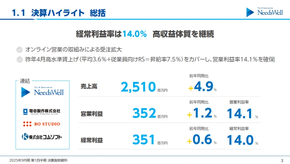 ニーズウェルは、特にオンライン営業の取り組みが功を奏し、受注が拡大したことが今四半期の成長を支えました。また、昨年4月に実施した高水準の賃上げ(平均3.6%、従業員向けRSを含めれば昇給率7.5%)も、営業利益率14.1%の確保に寄与しています。