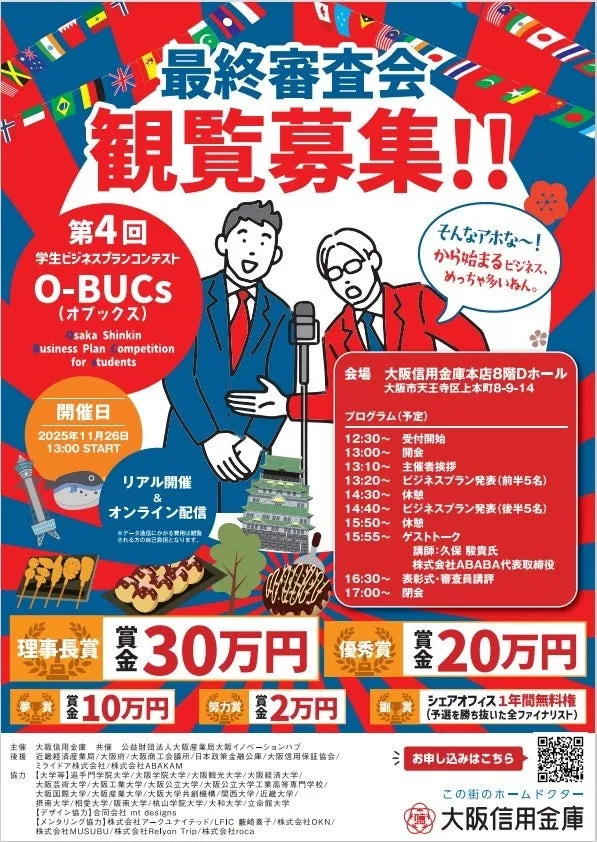 大阪信用金庫が主催する「第4回学生ビジネスプランコンテスト“O-BUCs (オブックス)”」の最終審査会が、2025年11月26日(水曜日)に開催されることが決定しました。会場は大阪信用金庫本店8階のDホールです。このイベントは、地域経済の活性化を目的としており、学生たちが持つ斬新なアイデアや挑戦する精神を育成することを目指しています。
