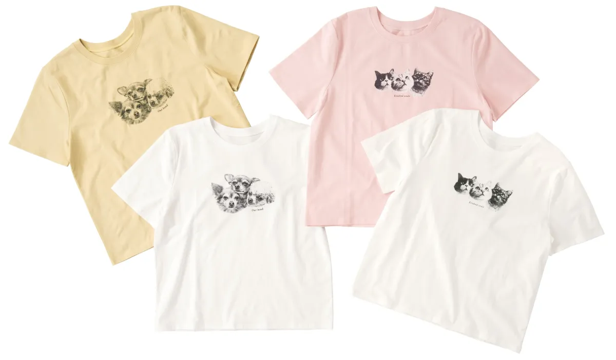 新たにラインナップされるのは、犬と猫をテーマにした2種類のフォトTシャツです。特徴的なのはモノクロの配色で、愛らしい3匹の犬と猫が描かれています。これにより、カジュアルながらも甘くなり過ぎず、デイリーコーデに合わせやすい印象を与えています。これから暖かくなる季節にぴったりなアイテムです。