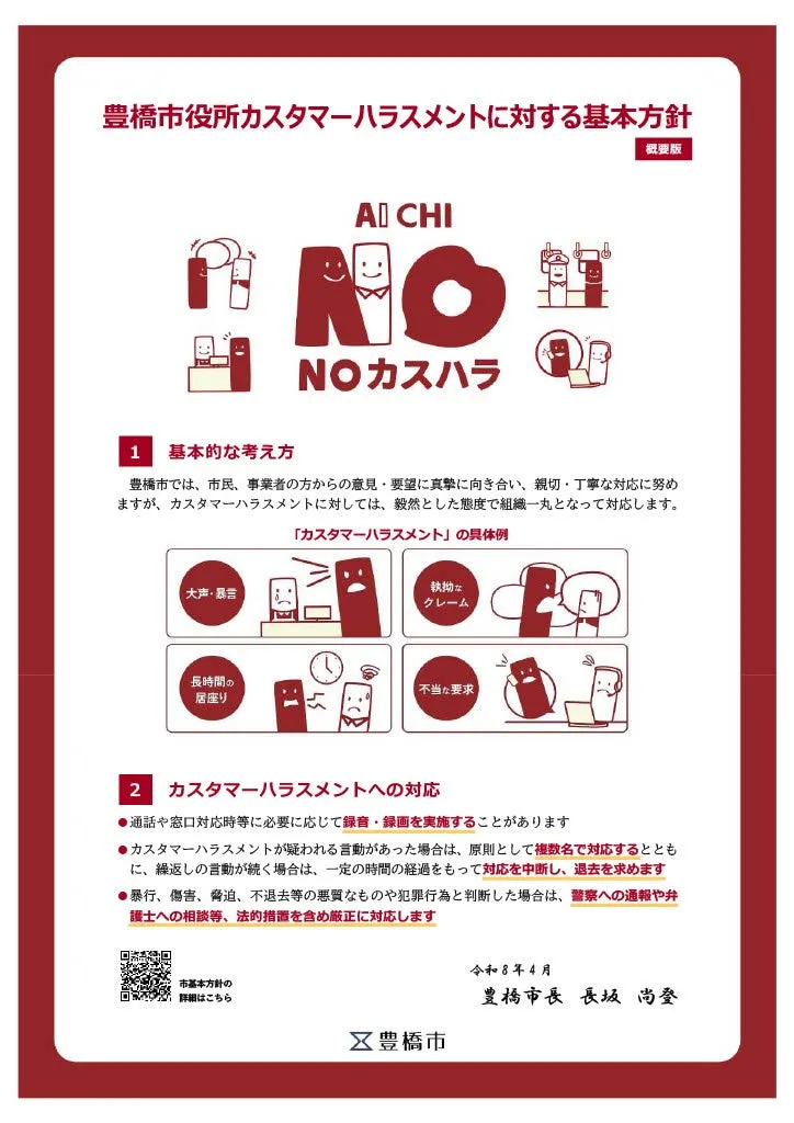 愛知県内では豊橋市だけでなく、他の自治体でもカスハラに対する基本方針の策定が進められています。豊橋市では、2026年4月から市役所の窓口などに基本方針の概要版を掲示し、大きなイラストとともにわかりやすい形で周知を図っています。また、詳細情報は市の公式ウェブサイトでも公開されており、市民が簡単にアクセスできるよう配慮されています。