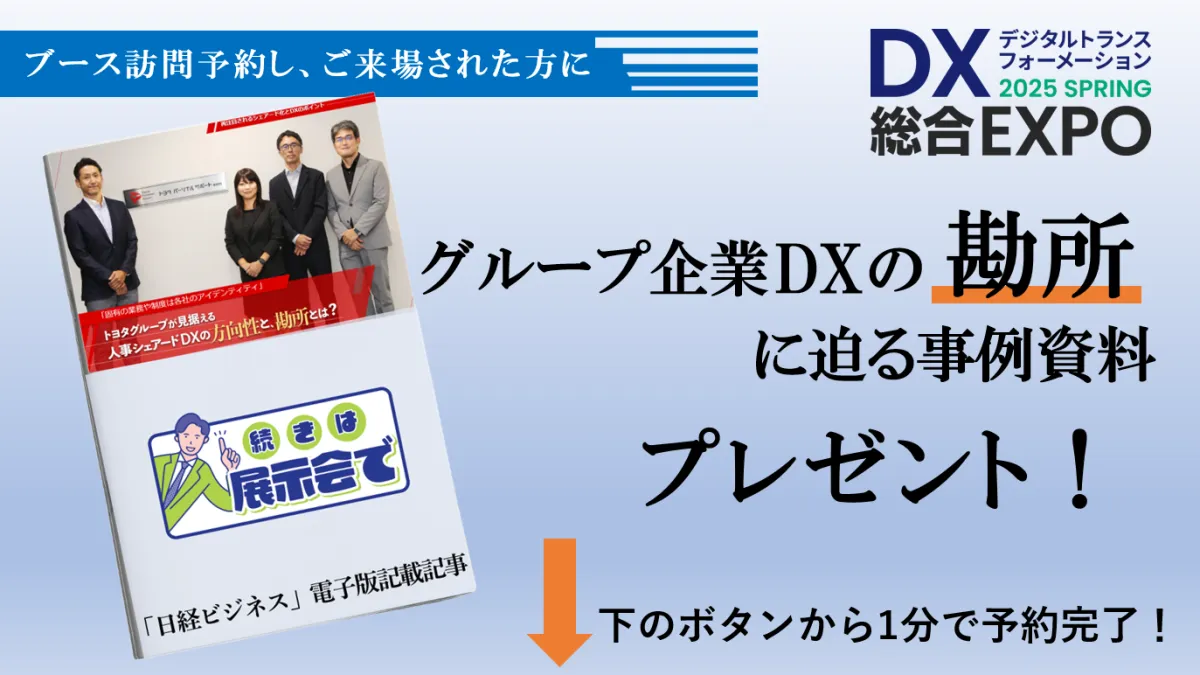 Techouseのブースを事前に予約した来場者には、特別資料として「トヨタグループ様事例に学ぶグループ企業DXの勘所に迫る資料」がプレゼントされるほか、業界リーダーに選ばれる人事システムのテーマで、選定理由や導入プロセスを詳しく紹介します。