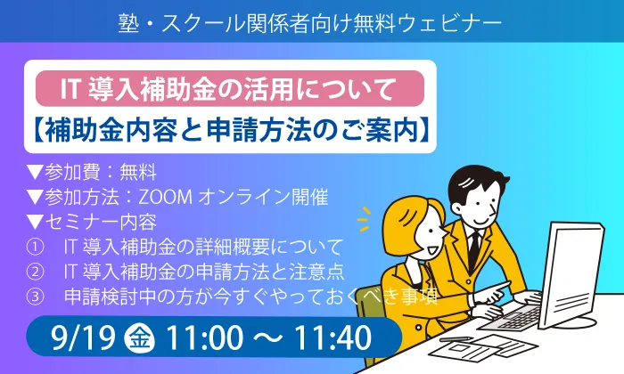 このように、オンラインセミナーでは、参加する経営者がスムーズにIT導入補助金を活用できるようになっています。また、補助金があれば、コストの面でも大きな負担を軽減し、教育現場のデジタルトランスフォーメーション(DX)の一助となることでしょう。