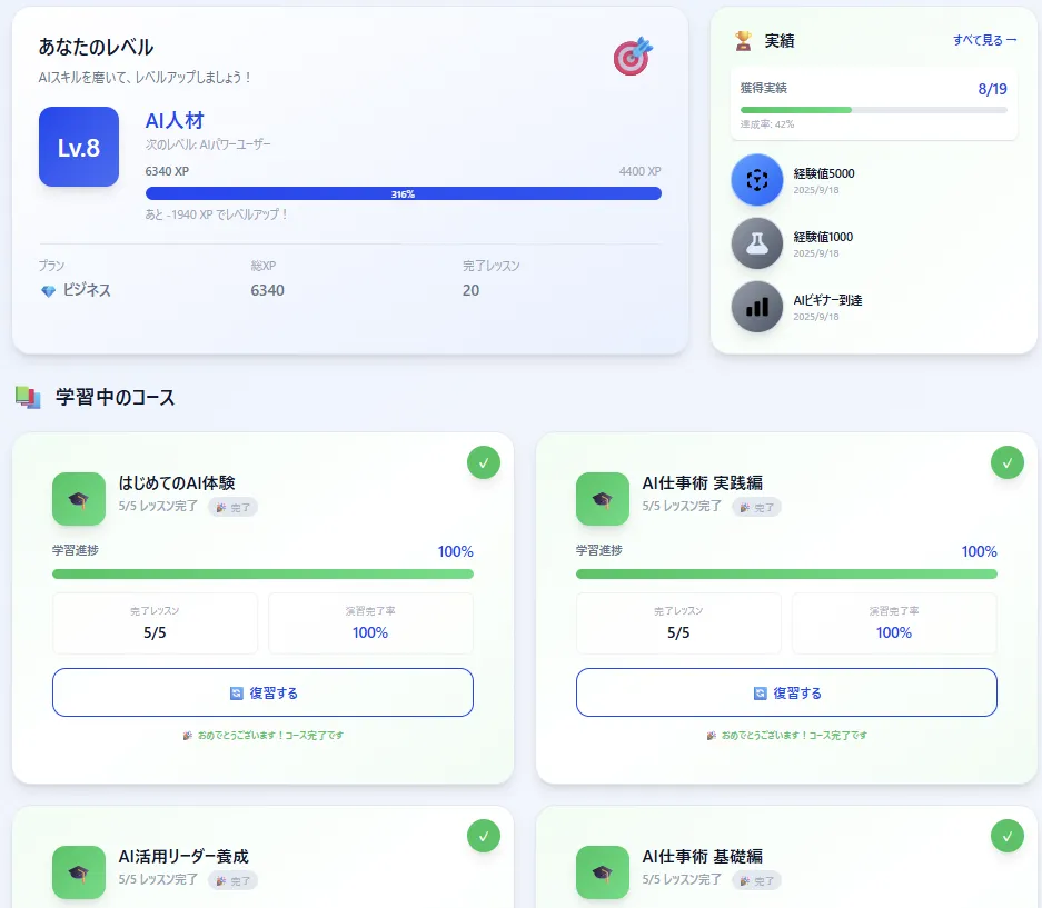 さらに、法人向けの管理機能を搭載しており、スタッフの進捗や習熟度を一元管理できるダッシュボードも提供。これにより、企業の教育・研修にも対応が可能です。