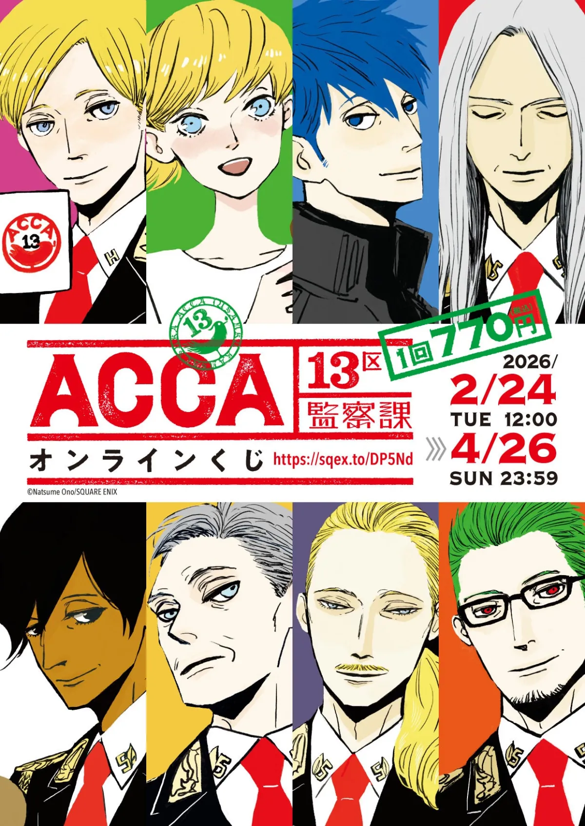 アニメファン必見のニュースが飛び込んできました。2026年2月24日正午より、スクウェア・エニックスのe-STOREにて「ACCA13区監察課」のオンラインくじの予約受付が開始されました。このくじでは、オノ・ナツメ先生が描き下ろしたキャラクターたちを使った多彩なグッズが手に入ります。