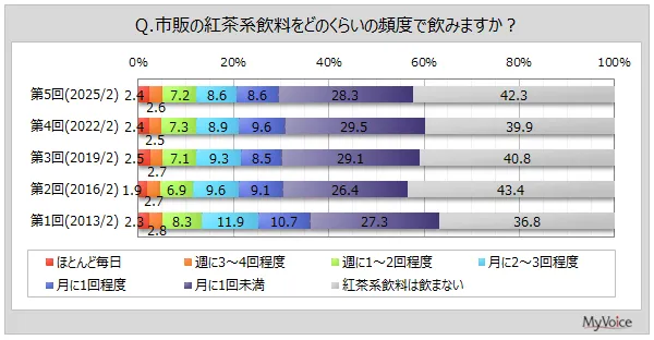 最近の調査によると、紅茶飲料を飲む人は約60%に達し、特にミルクティーやストレート・無糖が人気です。この調査は、マイボイスコム株式会社が行ったもので、2025年2月1日から7日にかけて、約9,000名のアンケートモニターに対して実施されました。調査対象は、市販のペットボトルや缶、紙パックの紅茶飲料で、テイクアウトやティーバッグは含まれていません。