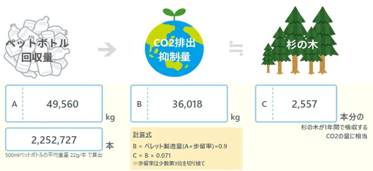 昨年度において、ウエルシア薬局はお客様の協力のもと、約2,252,727本のペットボトルを回収しました。これによって、CO2排出量が36,018kg削減されたことは、約2,577本の杉の木が1年間に吸収するCO2量に相当します。この活動は、地域の環境保護に大いに寄与しており、多くのお客様が積極的に参加しています。