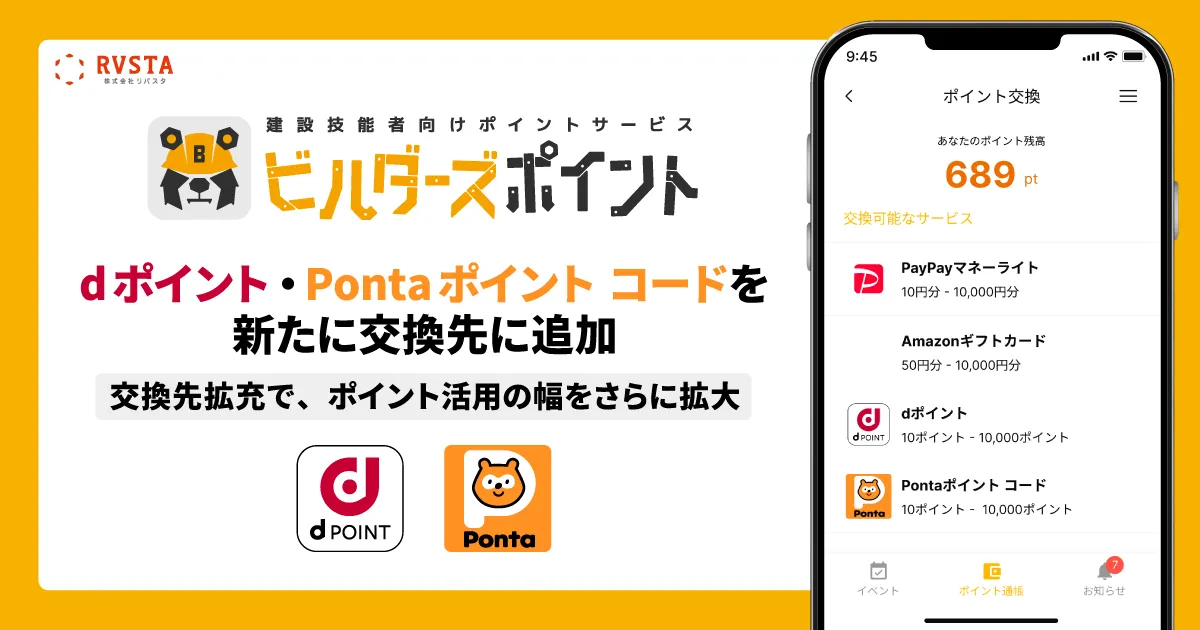 株式会社リバスタが提供する建設技能者向けポイントサービス「ビルダーズポイント」が、2026年3月2日より新たにdポイントとPontaポイントコードを交換先に追加することを発表しました。これにより、建設業界で働く技能者は、ポイントの交換先としてこれまでのPayPayマネーライトやAmazonギフトカードに加えて、計4種類の選択肢から選ぶことができるようになります。