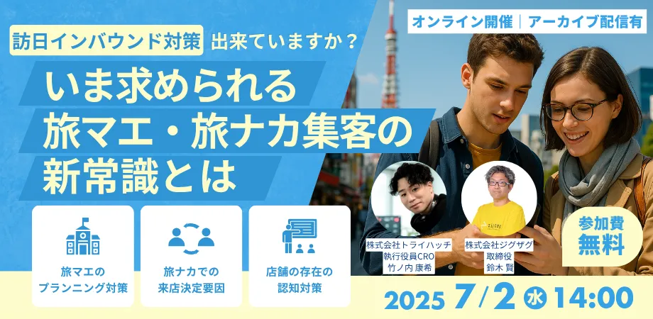 2025年7月2日(水)14時から、訪日インバウンド対策に焦点を当てた無料のオンラインセミナーが開催されます。主催には、訪日外国人の集客支援を行っている株式会社ジグザグと、MEO対策の専門家である株式会社トライハッチが参加します。このセミナーでは、訪日客を「選ばれ」させ、「来てもらう」ための実践的な施策や情報を共有します。