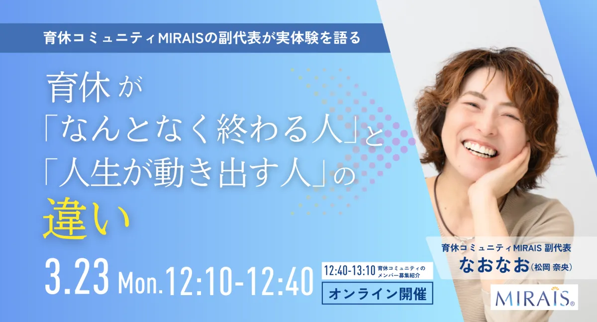育休中の過ごし方がどのように復職後の働き方に影響するのか、多くの親たちが頭を悩ませる課題です。育休コミュニティ「MIRAIS(ミライズ)」は、そんな育休者のための特別なオンラインイベント「育休が『なんとなく終わる人』と『人生が動き出す人』の違い」を2026年3月23日に開催します。このイベントは、延べ1,700名以上の育休者が夢中になって参加してきたコミュニティの知見を集めて、育休を境にどのように人生が変わっていくのかを探索します。
