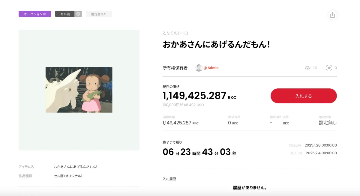 RAKUZA株式会社は、2025年の1月28日から2月4日の期間に、楽座NFTマーケットプレイスで第2回のセル画所有権のNFTオークションを開催します。アニメファンやコレクターにとって、このイベントは新たな所有の形を体験できる貴重な機会です。オークションでは、日本のアニメ作品「となりのトトロ」から、草壁メイの特徴的なシーンを描いたセル画の所有権がNFTとして出品されます。