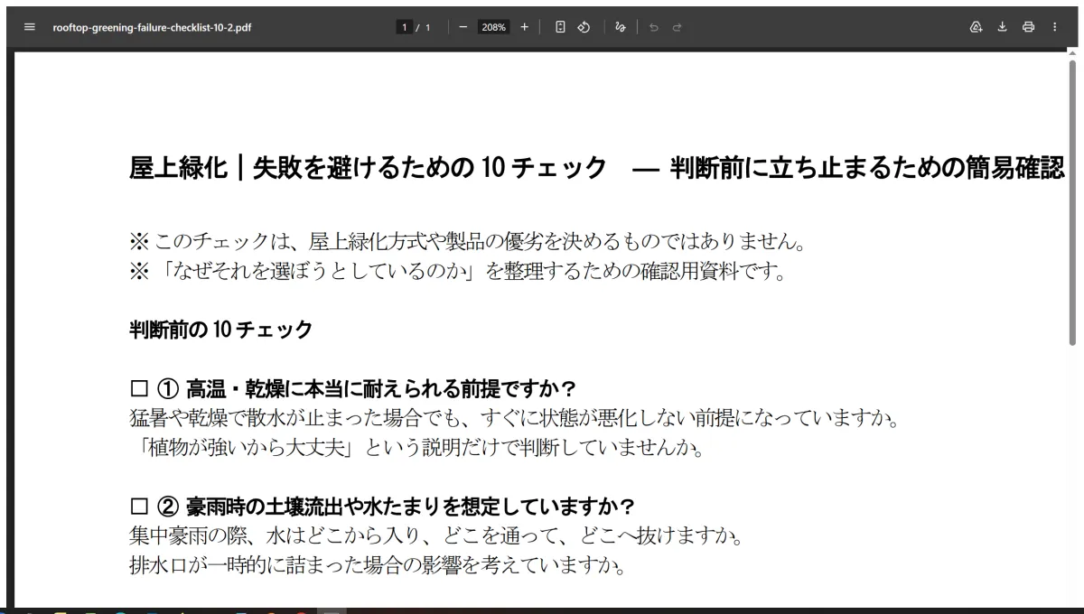 本サイトでは、「判断前の10チェックシート」を公開しています。これは、屋上緑化に関する決定のプロセスを見直すためのツールです。具体的にどんな前提で判断を進めようとしているのか、また確認し忘れている項目がないかを整理するためのものです。このチェックシートは、専門的な知識がなくても直感的に使えるように設計されています。