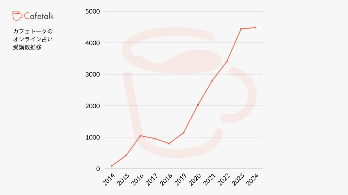 2023年と2024年の年間提供件数は4,000を超え、コロナ後も落ち込まずに受講数が上昇し続ける唯一のカテゴリとなっています。通算368名が占い師として登録され、その中の114名が実際にセッションを提供しています。受講者からの口コミも多数寄せられており、94%が満点評価を獲得しています。