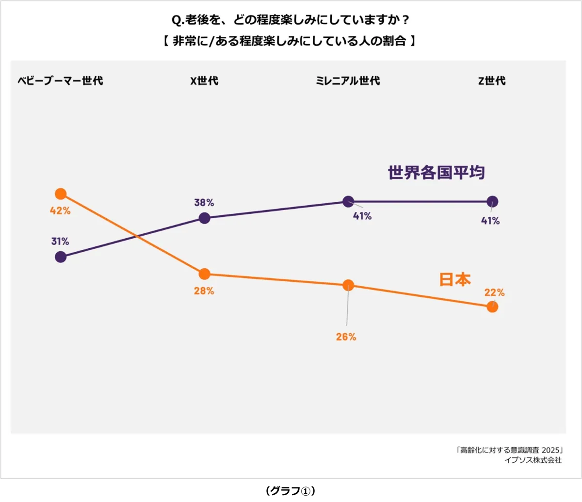 イプソス株式会社による大規模調査が行われ、日本と世界の世代間ギャップが明らかになりました。調査は日本を含む32か国から23,745人を対象に実施され、老後に対する期待感が国や世代で大きく異なることがわかりました。